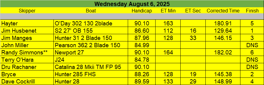 Race Results for August 7 Wednesday Night Race
