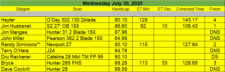 Race Results for July 31 Wednesday Night Race