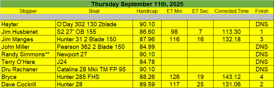 Race Results for September 11th Wednesday Night
